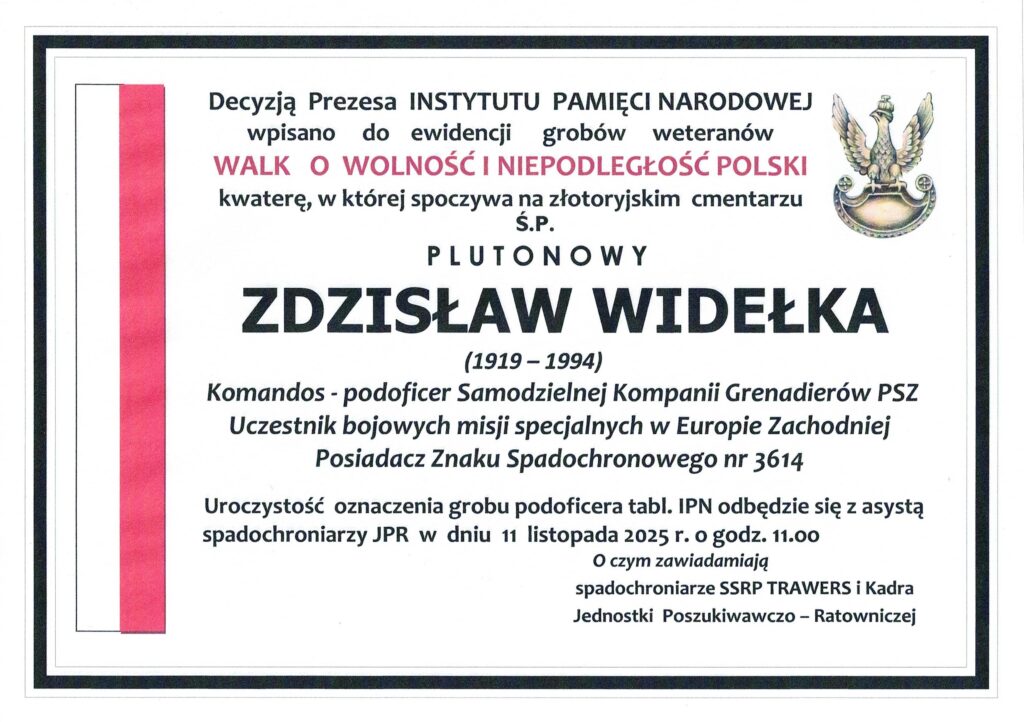W ramach obchodów Narodowego Święcia Niepodległości kadra Jednostki Poszukiwawczo-Ratowniczej i instruktorzy SS RP Trawers uczestniczyli w uroczystości oznakowania, zgodnie z decyzją Prezesa Instytutu Pamięci Narodowej, kwatery wiecznego spoczynku podoficera Polskich Sił Zbrojnych na Zachodzie, plut. Zdzisława Widełki (1919 – 1994), żołnierza elitarnej jednostki działań specjalnych Samodzielnej Kompanii Grenadierów, posiadacza Znaku Spadochronowego Nr 3614. W trakcie tego wydarzenia nastąpiło przyozdobienie mogiły tabliczką IPN „Grób Weterana Walki o Wolność i Niepodległość Polski”, co stanowi potwierdzenie ustawowego roztoczenia nad nim ochrony państwa polskiego. Po apelu pamięci, przywołującym imię i zasługi wojenne dzielnego komandosa, który był też jednym z fundatorów sztandaru dla HKL Trawers w 1978r. i przy jego wręczeniu asystował Stefanowi Karabczyńskiemu, odczytano decyzję kapituły Stowarzyszenia Spadochroniarzy Rzeczypospolitej Polskiej Trawers o pośmiertnym nadaniu Złotego Medalu „Tobie Ojczyzno”. Odznaczenie spoczęło na płycie grobu uhonorowanego Żołnierza. Zgromadzeni w tym dniu na złotoryjskiej nekropoli nawiedzili grób ich mentora, śp. ppor. Stefana Karabczyńskiego (1922 – 2007, żołnierza 1. SBS) oraz mogiły wielce zasłużonych działaczek antykomunistycznego podziemia niepodległościowego oraz komitetu obywatelskiego Solidarność: śp. Bożeny Mateckiej (1946 – 2004, spadochroniarki, lekarza med.) i śp. Marii Polakiewicz (1950 – 2016, psycholog). Po cichej modlitwie, ich kwatery udekorowano szarfami w barwach narodowych i przy dźwiękach żołnierskiej melodii „Śpij Kolego” oddano zmarłym należne honory. Natomiast w przeddzień tego święta w bazie lotniczej Baryt miało miejsce tradycyjne pn. Spotkanie Żołnierskich Pokoleń, które stało się też okazją do uhonorowania specjalnymi coinami spadochroniarzy JPR za działalność na rzecz kultywowania chlubnych tradycji polskich formacji działań specjalnych Commando. Z upoważnienia b. dowódcy 62. Kompanii Specjalnej, ppłk Andrzeja Żdana wręczenia wyróżnień dokonał komendant JPR.